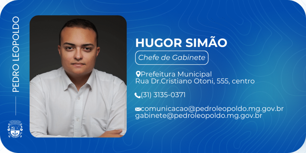 Hugor Simão é Chefe de Gabinete da Prefeitura de Pedro Leopoldo (MG), com formação em Marketing e pós-graduando em Comunicação Institucional Pública. Atuou como Secretário de Comunicação e Ouvidoria e hoje é referência na construção de estratégias públicas de posicionamento e relacionamento com a população.