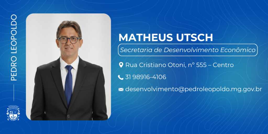 desenvolvimento local. Eleito vereador por Pedro Leopoldo, exerceu o mandato por quatro anos e cinco meses, período em que se destacou pela atuação firme e voltada ao interesse coletivo. Atualmente, está licenciado da Câmara Municipal para assumir o desafio de conduzir as políticas de atração de empresas, fortalecimento do comércio local e geração de emprego e renda. À frente da Secretaria de Desenvolvimento Econômico, Matheus Utsch trabalha para transformar Pedro Leopoldo em um ambiente cada vez mais favorável ao empreendedorismo, à inovação e à criação de oportunidades para todos os pedroleopoldenses.